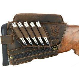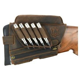 Schafterhöhung mit Patronenetui aus hochwertigstem und wasserfestem Nubuk-Rindsleder (imprägniert), mit Veloursleder-Futter. Dank Stretchgewebe und der Einstellbarkeit des hinteren Riemens ist die Erhöhung für jeden Schaft geeignet. Zudem ist durch den Reißverschluss ist eine schnelle Montage/Demontage garantiert. In den Varianten (Höhen) 28, 20 und 10 mm. Wahlweise in traditioneller brauner Ledergerbung (ideal für Holzschäfte), oder in grüner Ledergerbung (ideal für Kunststoff- oder Carbonschäfte).