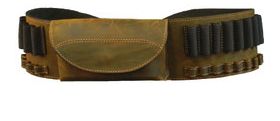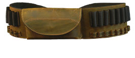 Patronengurt für Büchsenmunition aus hochwertigstem und wasserfestem Nubuk-Rindsleder (imprägniert), auf der Innenseite mit rutschfestem Veloursleder und Bauchtasche (auch für große Kaliber). Der Saum ist genäht und handgemalt. Länge 135 cm. Andere Längen auf Anfrage. Für 20 Patronen im Kaliber .223 bis .300