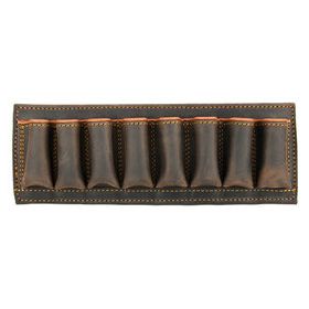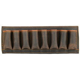 Patronen-Etui aus hochwertigstem und wasserfestem Nubuk-Rindsleder (imprägniert), Futter aus Antioxidationsstoff, elastische Zellen, Haltevorrichtung und Gürtelschlaufen. Der Saum ist genäht und handgemalt. Für 8 Patronen im Kaliber 12 oder 9 Patronen im Kaliber 20.