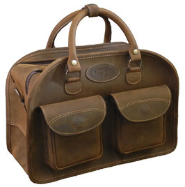Patronentasche aus hochwertigstem und wasserfestem Nubuk-Rindsleder (imprägniert), inkl. Brillentaschen und Schultergurt. Der Saum wurde komplett umnäht und handbemalt. Für 300 Schrotpatronen Kaliber 12.