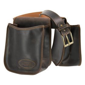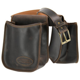Zwei Patronentaschen aus hochwertigstem und wasserfestem Nubuk-Rindsleder (imprägniert), inkl. Ledergürtel. Der Saum wurde genäht und handbemalt. Für insgesamt 110 Schrotpatronen im Kaliber 12 pro Tasche.