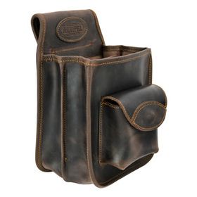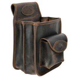 Patronentasche aus hochwertigstem und wasserfestem Nubuk-Rindsleder (imprägniert), zwei Innenteilen, Außentasche und Ledergürtel. Der Saum wurde genäht und handbemalt.