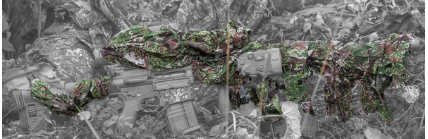 Das Rifle Camo von Ghosthood ist die perfekte Tarnung für die Jagdwaffe und gehört zu jedem Jagdwaffenzubehör. Das Set umfasst drei Teile, die sich nahezu passgenau an alle gängigen Jagdwaffen anbringen lassen. Es besteht aus den Komponenten für Jagdwaffe samt Zielfernrohr und beispielsweise Schalldämpfer, als auch für ein Zweibein und den Hinterschaft. Hiermit erreicht man einen abgerundeten Tarneffekt durch Verwischen der Konturen. Um die Tarnwirkung zu erhöhen, können Materialien aus der Umgebung an weiteren Befestigungspunkten (CFIX) an dem Rifle Camo angebracht werden.