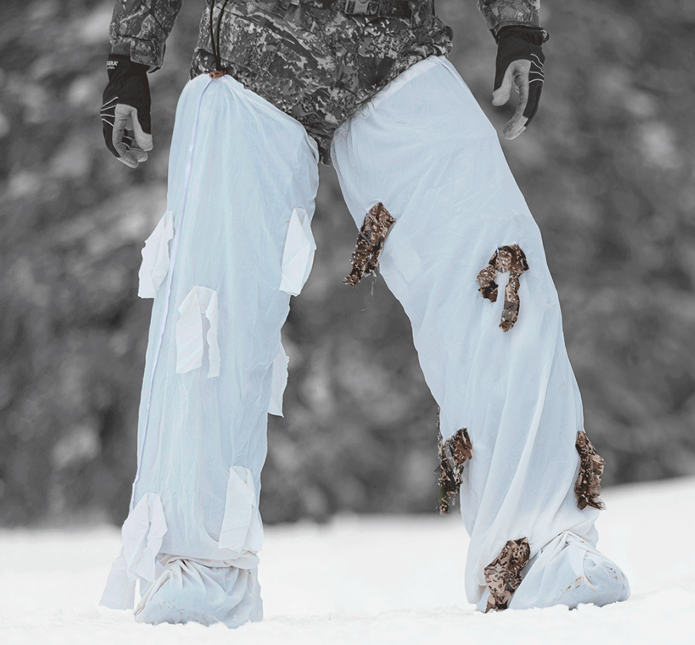 Bei der Jagd im Schnee dürfen die Ghosthood Snow Legs nicht fehlen. Sie sind die perfekte Ergänzung zu Ihrer Schnee-Tarnung. Die Snow Legs werden als Beinlinge getragen und sorgen für einen abgerundeten Tarneffekt durch Verwischen der Körperkonturen und Anpassung an den hellen Untergrund. Die an den Beinlingen, seitlich angebrachten Schlaufen, dienen als Befestigungsmöglichkeit am Gürtel oder anderen Befestigungspunkten der Jagdhose. Um die Tarnwirkung zu erhöhen, können Materialien aus der Umgebung an weiteren Befestigungspunkten (CFIX) an den Tarn-Beinlingen angebracht werden.
