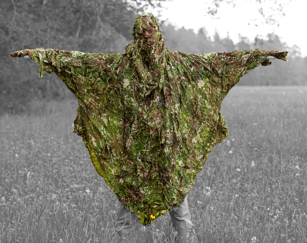 Der Ghosthood Ghost-Hoodie ist ein ultraleichter Tarnanzug. Mit nur 395 g ist er leichter als herkömmliche Tarnanzüge und kann durch sein geringes Packmaß leicht im Rucksack mitgenommen werden.