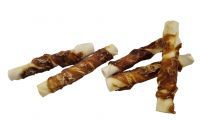 Hierbei handelt es sich um schonend getrocknetes Unterhaut-Bindegewebe (die zweite Hautschicht) vom Rind mit leckerem Entenfleisch umwickelt. Die Rollies bestehen zu 43,6 % aus magerem Entenfleisch und zu 52,3 % aus getrockneter Rinderhaut und sind ca. 12,5 cm lang und wiegen im Schnitt ca. 28 g. Dieses Gewebe ist sehr stark und zäh.