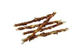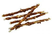 Hierbei handelt es sich um schonend getrocknetes Unterhaut-Bindegewebe (die zweite Hautschicht) vom Rind mit leckerem Entenfleisch umwickelt. Die Rollies bestehen zu 59,5 % aus magerem Entenfleisch und zu 34,8 % aus getrockneter Rinderhaut und sind ca. 25 cm lang und wiegen im Schnitt ca. 26 g. Dieses Gewebe ist sehr stark und zäh.