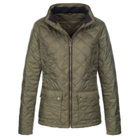 Leichte Damen-Steppjacke aus strapazierfähigem Polyester-Oberstoff und warmer Polyesterwattierung. Mit modischen Details wie Stehkragen und aufgesetzten Taschen mit Druckknöpfen. Braune Paspelierung an Kragen, Vorderkante und Aufhänger (Kunstleder).