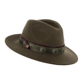Klassischer Filzhut aus 100%Wolle, breite Krempe, wasserabweisend, knautschbar und rollbar, kann problemlos mit wenigen Handgriffen anschließend wieder in Form gebracht werden. Zierband mit Hirsch-Motiv.