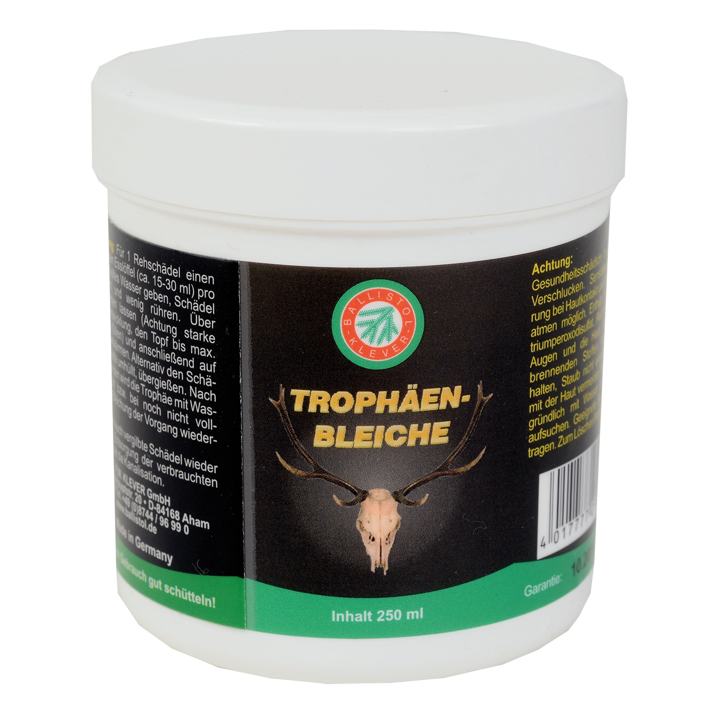 Bleicht Schädel und andere Knochenteile bei der Erstpräparation oder Restaurierung rein weiß. Inhalt: 250 g.