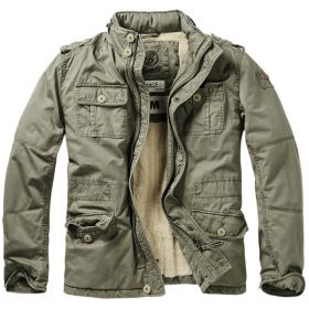 Modifizierte Feldjacke mit Teddyfutter, Logo Badge, versteckte Kapuze im Kragen, Stehkragen mit Kunstlederapplikation. Used-Effekte.