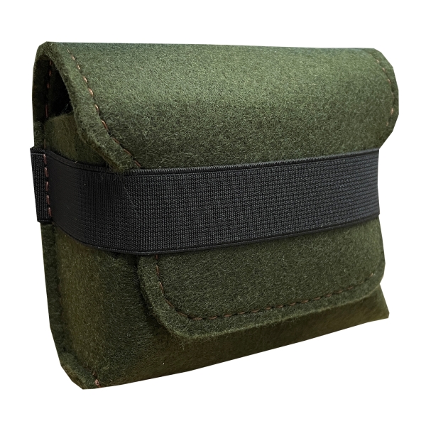 Filzpatronenetui groß für 5 Kugelpatronen + 4 Schrotpatronen. Patronenetui aus olivfarbenem Wollfilz. Leicht und geräuschlos zu öffnen. Gummizug an der Verschlusslasche. Innen werden die Patronen durch Gummischlaufen gehalten.