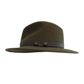 Klassischer Filzhut, breite Krempe, wasserabweisend, knautschbar und rollbar, kann problemlos mit wenigen Handgriffen wieder in Form gebracht werden, mit Leder-Garnitur.