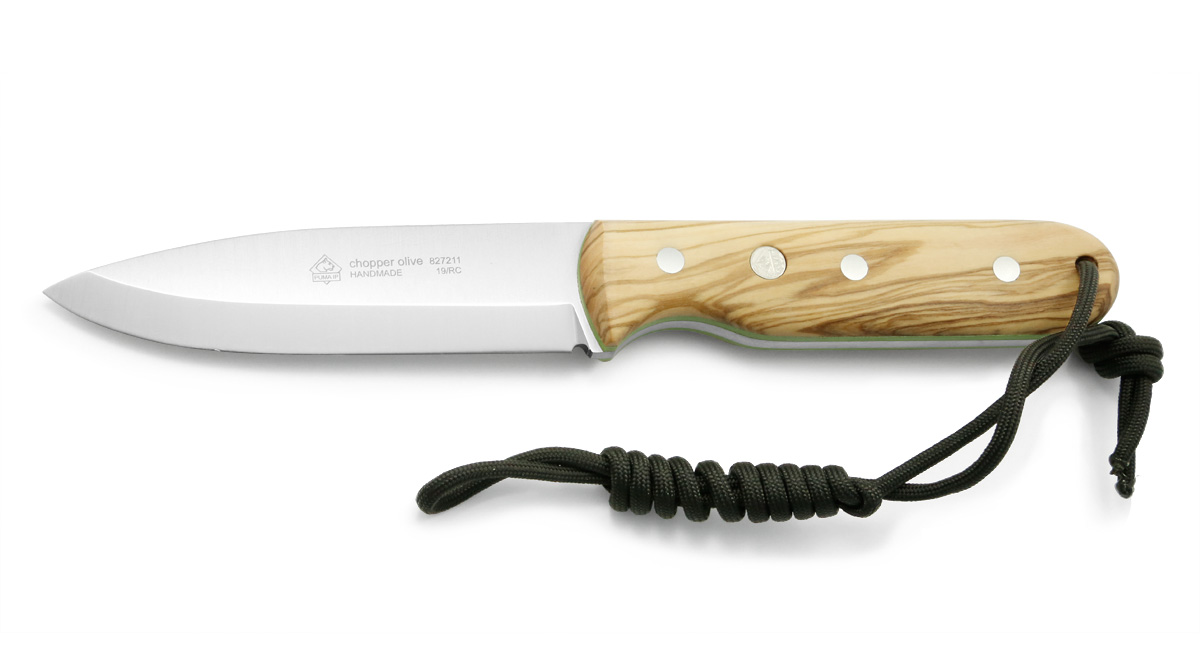 Das Puma IP Model CHOPPER OLIVE ist ein robustes Allroundmesser. Die Drop-Point Klinge aus rostfreiem Böhler N-690Co Hochleistungsstahl in Full Tang Bauweise ist auch für den harten Einsatz geeignet. Die Griffschalen aus Olivenholz liegen auf einer grünen Fiberglaslage und werden durch drei Nieten gesichert. Die sauber angepasste Lederscheide ist bereits mit einer Aufnahme für einen Feuerstahl ausgestattet.