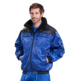 Kontrastfarbige Arbeitsbekleidung in besonders robuster Qualität für härtesten Arbeitsalltag aus wasserabweisendem Mischgewebe. Pilotenjacke Zwei Schubtaschen vorne, zwei große Brusttaschen mit Patte, davon die rechte mit einer innenliegenden, eingearbeiteten Handy-Tasche. Eine Sicherheits-Innentasche mit Reißverschluss. Links Ärmeltasche mit Stiftefächern und kleiner Aufbewahrungstasche mit Reißverschluss. Der elastische Bund und die elastischen Ärmelbündchen sorgen für den perfekten Abschluss der Jacke. Innenkragen sowie Body mit weichem, angenehm warmem Faserpelzfutter. Ärmel mit Steppfutter.