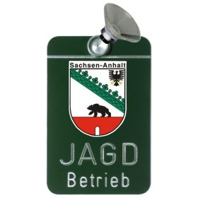 Aus grün-eloxiertem Aluminium mit eingravierter Schrift. Saugnapf hält durch einen Magneten das Schild. Maße: 8 x 12 cm.