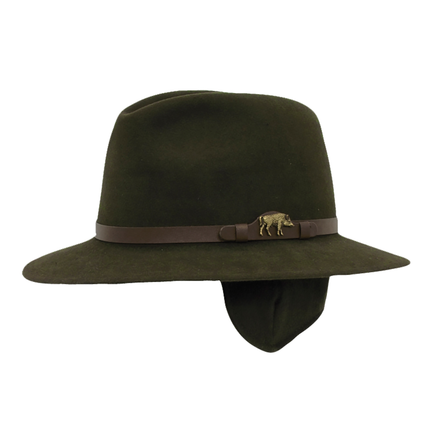 Klassischer, hochwertiger Filzhut, breitere Krempe, stark wasserabweisend, knautschbar und rollbar, kann problemlos mit wenigen Handgriffen wieder in Form gebracht werden. Hut mit herausklappbaren Ohrenklappen und Ledergarnitur mit Wildschwein-Applikation aus Metall.