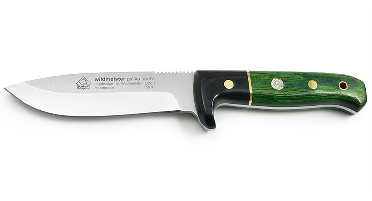 Meisterlich kommt es daher, das Modell PUMA IP wildmeister pakka. Eine 11,7 cm lange Klinge aus 440C-Stahl, Backen aus schwarzem Micarta, kombiniert mit eingepassten Griffschalen aus grün gefärbtem Pakkaholz machen das Messer zum echten Hingucker. Einsetzbar als Jagd- oder Outdoormesser.