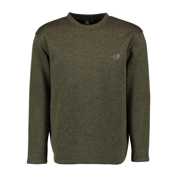 Wärmende Strickfleecequalität in jagdlicher Melangeoptik mit ?Keilerkopf?-Stickerei auf linker Brustseite.