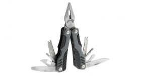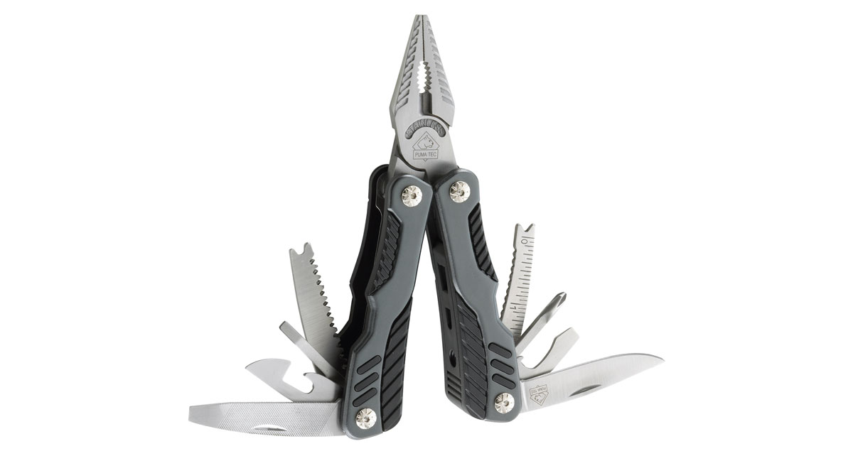 Funktionen: Messerklinge, Kreuz- und Schlitzschraubendreher, Feile, Säge und Zange