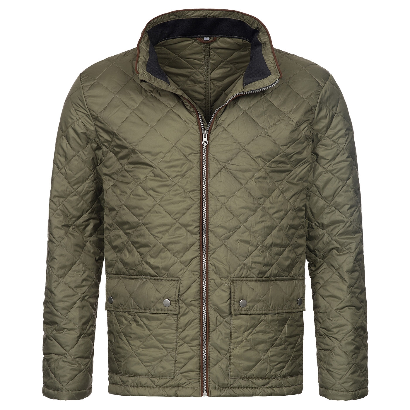 Leichte Herren-Steppjacke aus strapazierfähigem Polyester-Oberstoff und warmer Polyesterwattierung. Mit modischen Details wie Stehkragen und aufgesetzten Taschen mit Druckknöpfen. Braune Paspelierung an Kragen, Vorderkante und Aufhänger (Kunstleder).