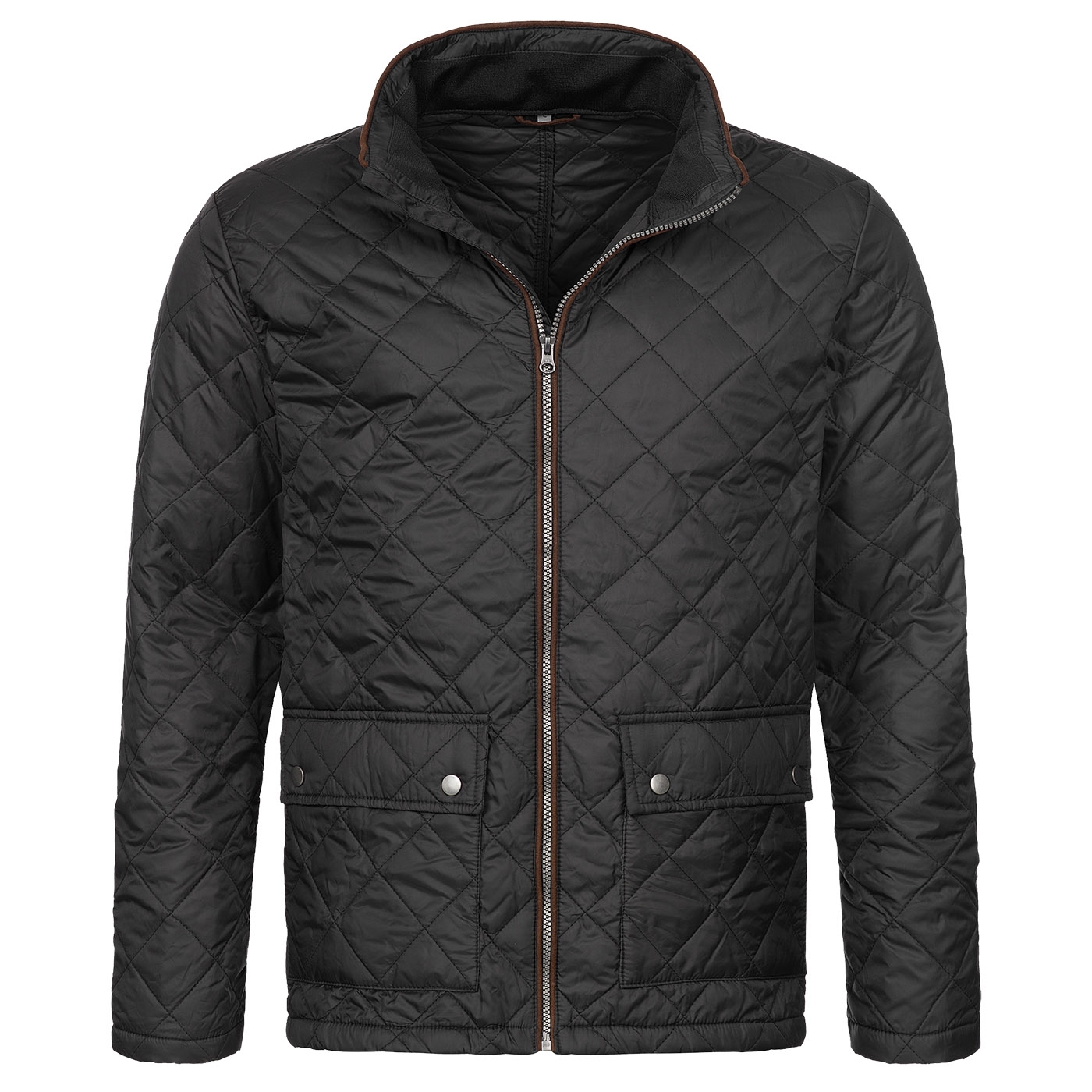 Leichte Herren-Steppjacke aus strapazierfähigem Polyester-Oberstoff und warmer Polyesterwattierung. Mit modischen Details wie Stehkragen und aufgesetzten Taschen mit Druckknöpfen. Braune Paspelierung an Kragen, Vorderkante und Aufhänger (Kunstleder).