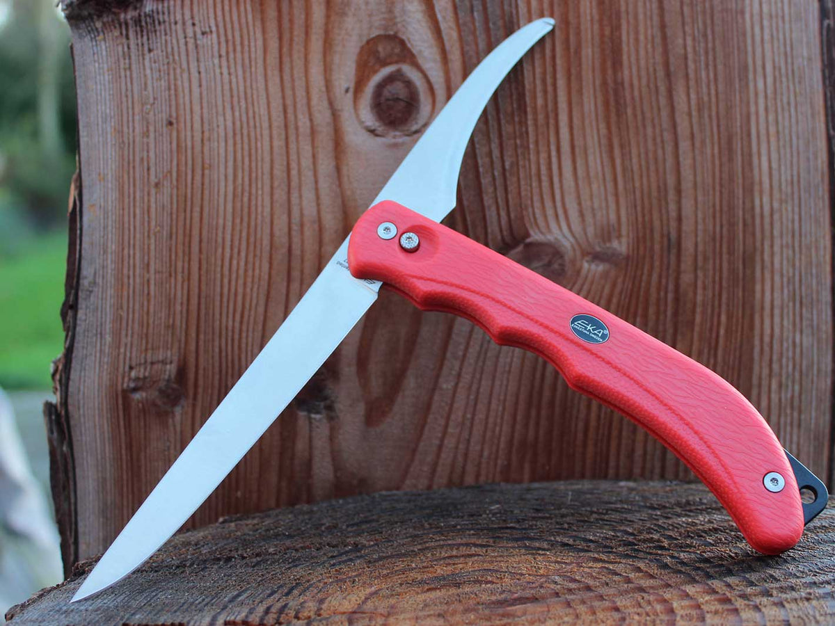 Es ist die Weiterentwicklung des Fishblade von EKA, ebenfalls gefertigt aus dem rostfreien Sandvik Stahl, schnell wieder zu schärfen und sehr schnitthaltig.