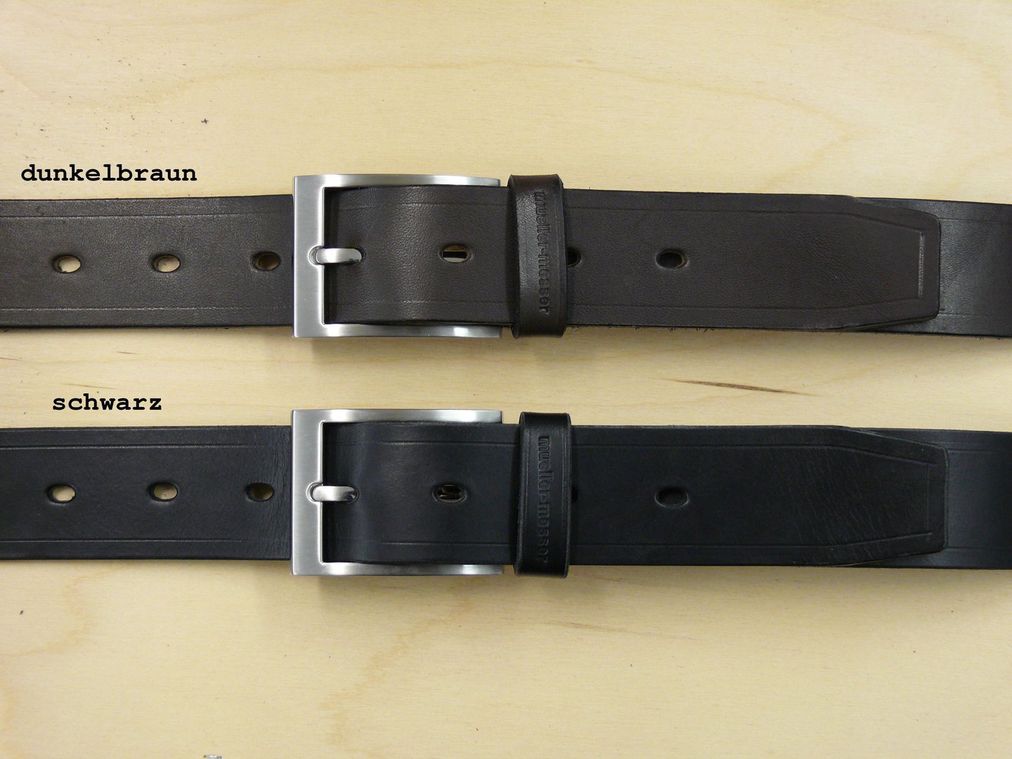 Handgefertigter Gürtel aus pflanzlich (lohgar, vegetabil) gegerbtem Leder, 36 mm breit in der Stärke ca. 3,0 mm mit hochwertiger Shnalle im modernen Design, massive Verarbeitung, mit flachem Dorn, silberfarben gebürstet, Riemenende trapezförmig