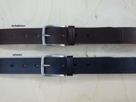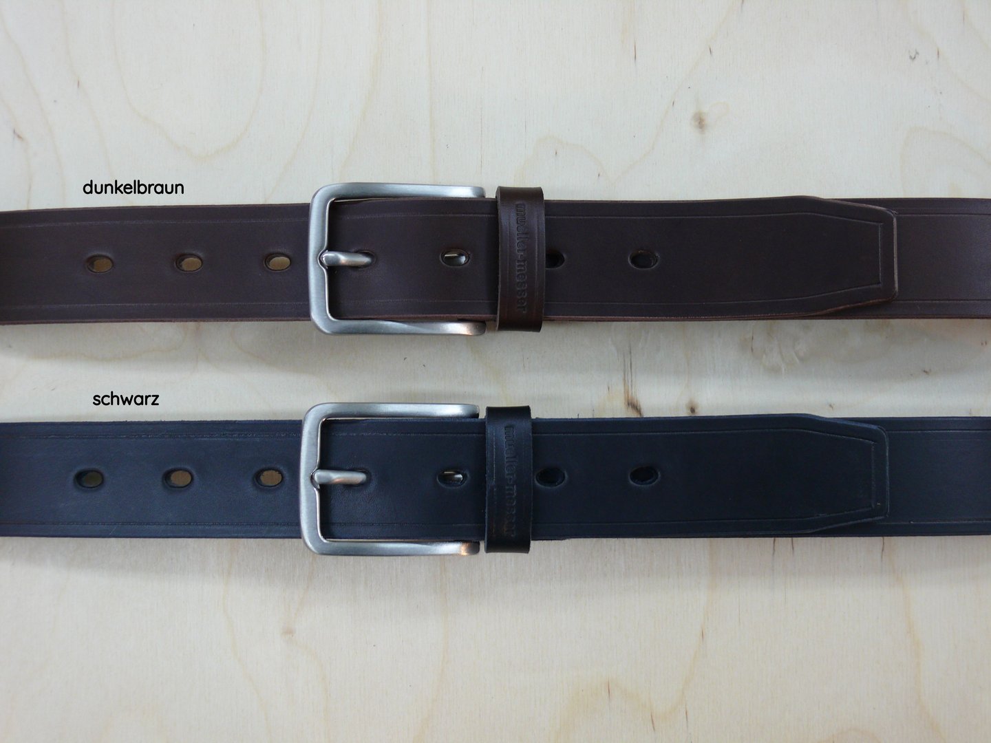 Handgefertigter Gürtel aus pflanzlich (lohgar, vegetabil) gegerbtem Leder, 36 mm breit in der Stärke von ca. 3,0 mm mit hochwertiger Schnalle aus massivem Edelstahl im modernen Design, Oberfläche matt gebürstet, Riemenende trapezförmig