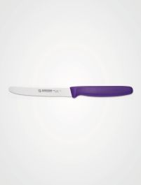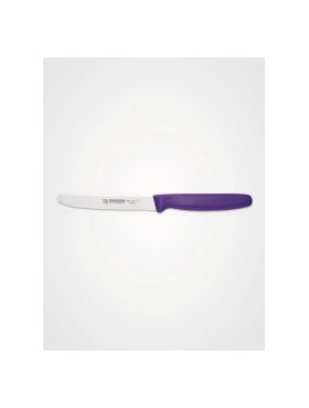 Zu den Hauptmerkmalen des Messers gehören die 11 cm lange, mit einem Wellenschliff versehene Klinge sowie der violette Kunststoffgriff.
