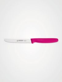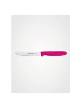 Zu den Hauptmerkmalen des Messers gehören die 11 cm lange, mit einem Wellenschliff versehene Klinge sowie der pinke Kunststoffgriff.