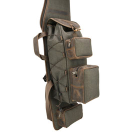 Waffenfutteral für Büchsen mit Zieloptik als Rucksack aus extrem abriebfestem Cordura©-Gewebe und hochwertigstem und wasserfestem Nubuk-Rindsleder (imprägniert). Futter aus synthetischem Fell. Der Rucksack ist individuell einstellbar und hat mehrere Taschen mit insgesamt ca. 20 Liter. Die Griffe und Schulterriemen sind ebenfalls aus demselben Leder gearbeitet und haben auf der Innenseite Neopren. Der Saum wurde genäht.