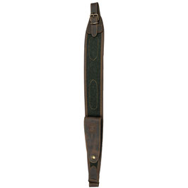 Gewehrriemen aus bestem Moessmer-Loden und hochwertigstem und wasserfestem Nubuk-Rindsleder (Imprägniert), rückseitig gepolstert mit rutschfestem Neopren und robusten Schnallen. Der Saum wurde komplett umnäht. In der Variante BRL07/P mit Patronenetui für zwei Schuss.