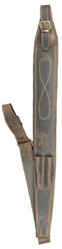 Gewehrriemen aus hochwertigstem und wasserfestem Nubuk-Rindsleder (imprägniert), rückseitig gepolstert mit rutschfestem Neopren und robusten Schnallen. Der Saum wurde außerdem komplett umgenäht. Mit offenem Patronenetui für zwei Schuss.