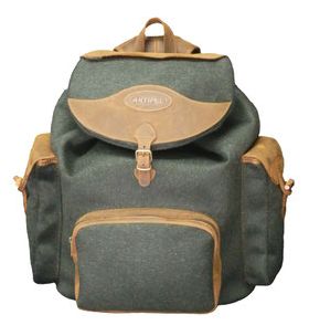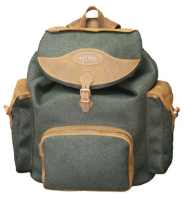 Rucksack aus bestem Moessmer-Loden und hochwertigstem und wasserfestem Nubuk-Rindsleder (imprägniert), Futter aus waschbarem und luftdurchlässigem Stoff. Vordertasche, Innentasche mit Reißverschluss und individuell einstellbaren Schulterriemen. Der Saum wurde genäht und handbemalt.