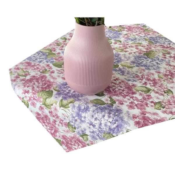 Mitteltischdecke mit floralem Hortensienmotiv. Ein Blickfang bei gemütlichen Tischrunden.