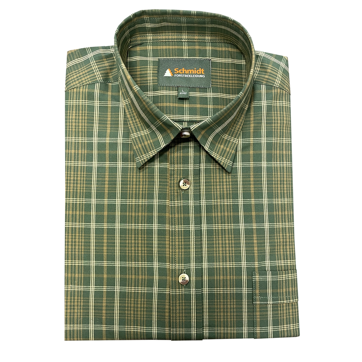 Klassisches Kurzarm-Karohemd von Schmidt mit Umlegekragen ? der perfekte Begleiter für Ihr nächstes Outdoor-Abenteuer oder den Jagdausflug. Hergestellt aus hautsympathischer Baumwolle bietet dieses Hemd höchsten Tragekomfort, selbst bei längeren Einsätzen im Freien. Die bequeme Weite und die optimale Rückenlänge sorgen für eine ideale Passform. Die durchgehende Knopfleiste ist mit stilvollen Knöpfen in Naturoptik versehen, zudem gibt es links eine praktische Brusttasche mit Knopfverschluss für zusätzlichen Stauraum von kleinen Utensilien. Ob auf der Pirsch oder beim Wandern ? mit diesem Karohemd sind Sie immer gut ausgestattet.