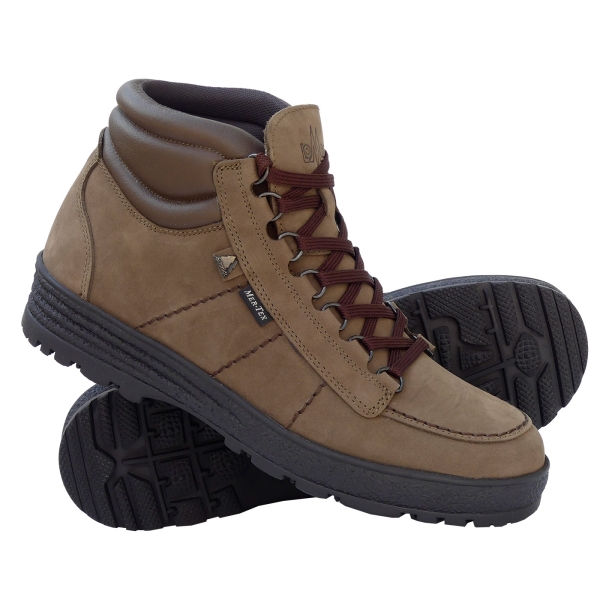 Feinstes Nubukleder in erstklassiger Verarbeitung mit herausnehmbarem Fußbett. Mit wasserabweisender Membrane und langlebiger Gummi-Profilsohle. Halbstiefel mit hohem gepolsterten Schaft.