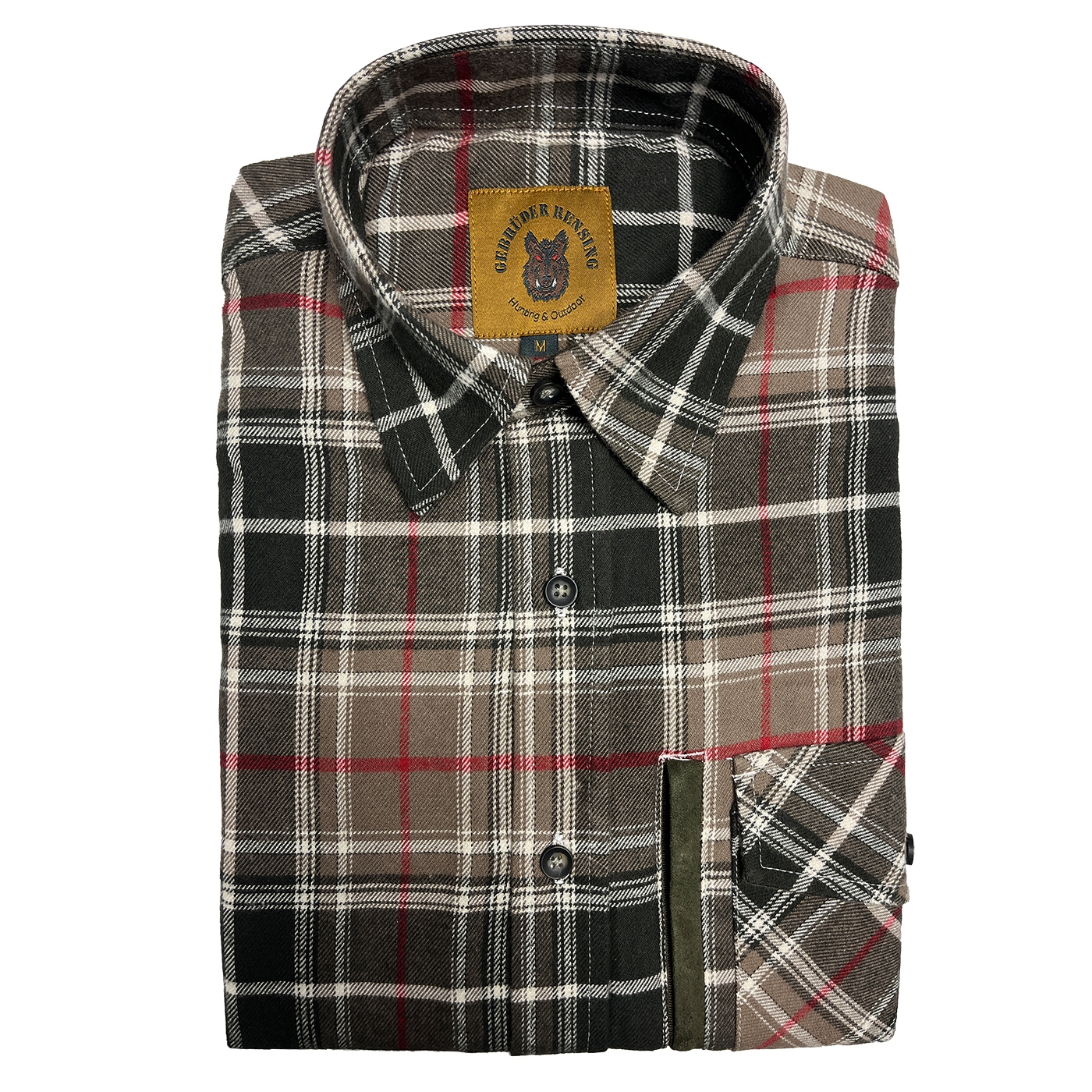 Entdecken Sie das Rensing Flanell-Karohemd in stilvollem beige/oliv/rot, ideal für Jagd, Freizeit und Waldspaziergänge. Dieses schicke Langarm Hemd aus bequemer Baumwollqualität bietet höchsten Tragekomfort. Es ist ausgestattet mit einer praktischen Brusttasche mit Knopfverschluss und einer zusätzlichen Reißverschluss-Brusttasche für sicheren Stauraum. Die Velourslederimitat-Besätze an den Ärmeln und der abgerundete Saum verleihen dem Hemd eine edle Note.