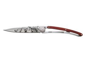 Der Griff des einzigartigen Messers ist mit Korallenholz (oder Padouk) besetzt. Korallenholz ist eine Holzart, die schon lange für Besteck wegen ihrer edlen roten / bernsteinfarbenen Akzente (von denen sie ihren Namen erhielt), ihrer Robustheit und ihrer ausgezeichneten Beständigkeit gegen Feuchtigkeit verwendet wird.