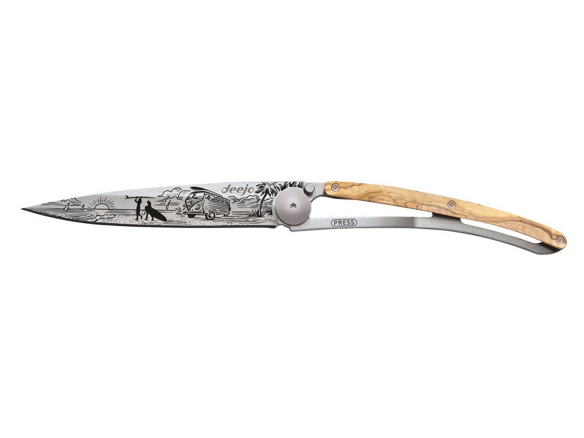 Ultraleichtes Messer aus Z40C13 Edelstahl mit matter Oberfläche, mit schöner Gravur für den VW-Bus und Camping Fan. Auf der Klinge des Deejo-Messers ist ein Paar beim Strandurlaub mit Surfbrett, Sonnenuntergang, Palmen und Meer und dabei das Bild des VW-Busses. Etwas ganz besonderes für VW-Bus Liebhaber!