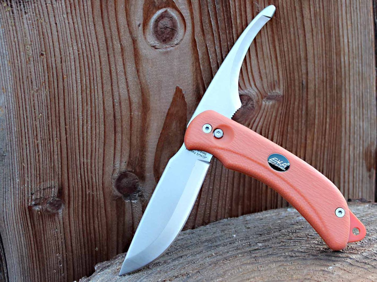 Mit dem EKA Swingblade hat man alles dabei, was man für die einfache rote Arbeit im Wald braucht, man hat zwei vollwertige Messer auf einmal in der Hand, mit der Aufbruchklinge öffnet man den Wildkörper zum Einen sehr schnell und zum Anderen kann man keine Innereien mehr beschädigen.