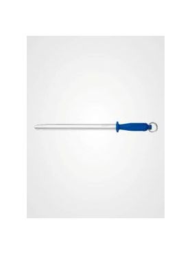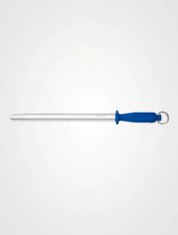 Bei einem Kauf erhalten Sie einen Giesser Abziehstahl mit einer Länge von 31 cm, einer ovalen Klinge und einem blauen Griff.