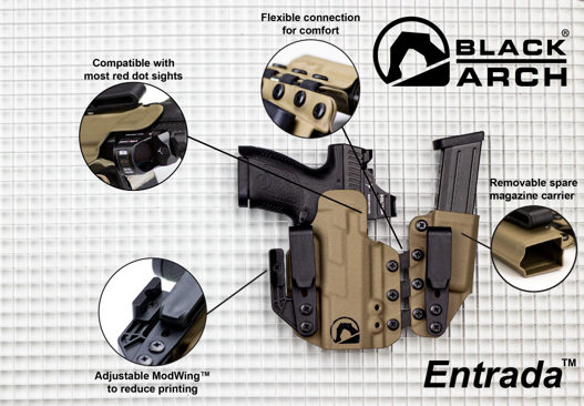 Das Entrada Holster von Black Arch ist das erste Holster, dass speziell für die Appendixtrageweise entwickelt wurde. Die Magazinhalter des Holsters sind über flexible Verbindungsstücke mit dem Kydexholster verbunden damit dieses sich an den Körper des Trägers anpasst. Neben den flexiblen Verbindungsstücken verfügt das Entrada auch über einen sog. ModWing. Dieser reduziert die Last des Gürtels auf die Hüfte.