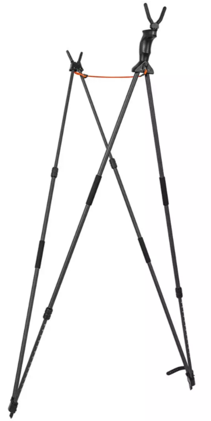 Mit dem patentierten Pistolengriff hat man einen Schwenkbereich von 20 Meter bezogen auf 100 Meter Schussentfernung und kann dadurch zuverlässig im Ziel bleiben. Die Auflagegabel ist mit einem Sicherheitsschieber ausgestattet, hier kann die Jagdwaffe auf dem Pirschstock fixiert werden. Es ist auch möglich die Waffe mittels eines Pins, fest mit einem Pirschstock zu verbinden.
