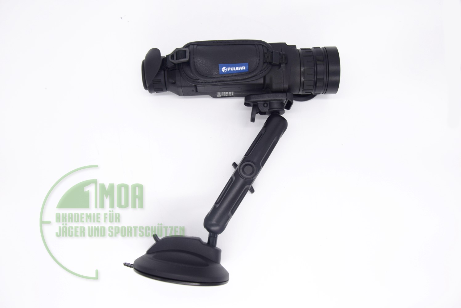 Die Reichweite bei der Übertragung der Bilder kann bis zu 10m Betragen und um diesen Vorteil zu nutzen gibt es verschiedene Befestigungsmöglichkeiten von PULSAR Geräten an Bäumen, Autos, Fenstern etc. Eine der Befestigungsmöglichkeiten ist der PULSAR Flachglasadapter. Mittels das Adapters können Sie Pulsar Geräte an glatten Oberflächen anbringen. Wir nutzen den PULSAR Flchglasadapter, um die Geräte außerhalb des Autos zu befestigen. Mit Hilfe der App lassen wir uns das Bild des Gerätes auf unser Mobiltelefonübertragen und können auf diese Weise bei langsamer Fahrt beobachten. Möchte man aus einem Auto beobachten ist man darauf angewiesen die Fenster zu öffnen, möchte man dies nicht, kommt nicht daran vorbei, das Gerät außerhalb der Fahrgastzelle zu montieren. Der Flachglasadapter verfügt über ein ¼? Gewinde (normales Stativgewinde), zwei Kugelkopfgelenke, eine Schnellverschlussplatte zum einfachen Entnehmen des Gerätes und einen Saugnapf. Der Adapter kann senkrecht oder waagerecht angebracht werden.