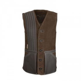 Die Schaftauflage dieser Lederweste ist mit konrastfarbenem Leder abgesetzt und gepolstert. Der untere Saum ist an beiden Seiten geschlitzt für bessere Bewegungsfreiheit, wie auch die Schulternaht auf der Seite der Schießauflage.